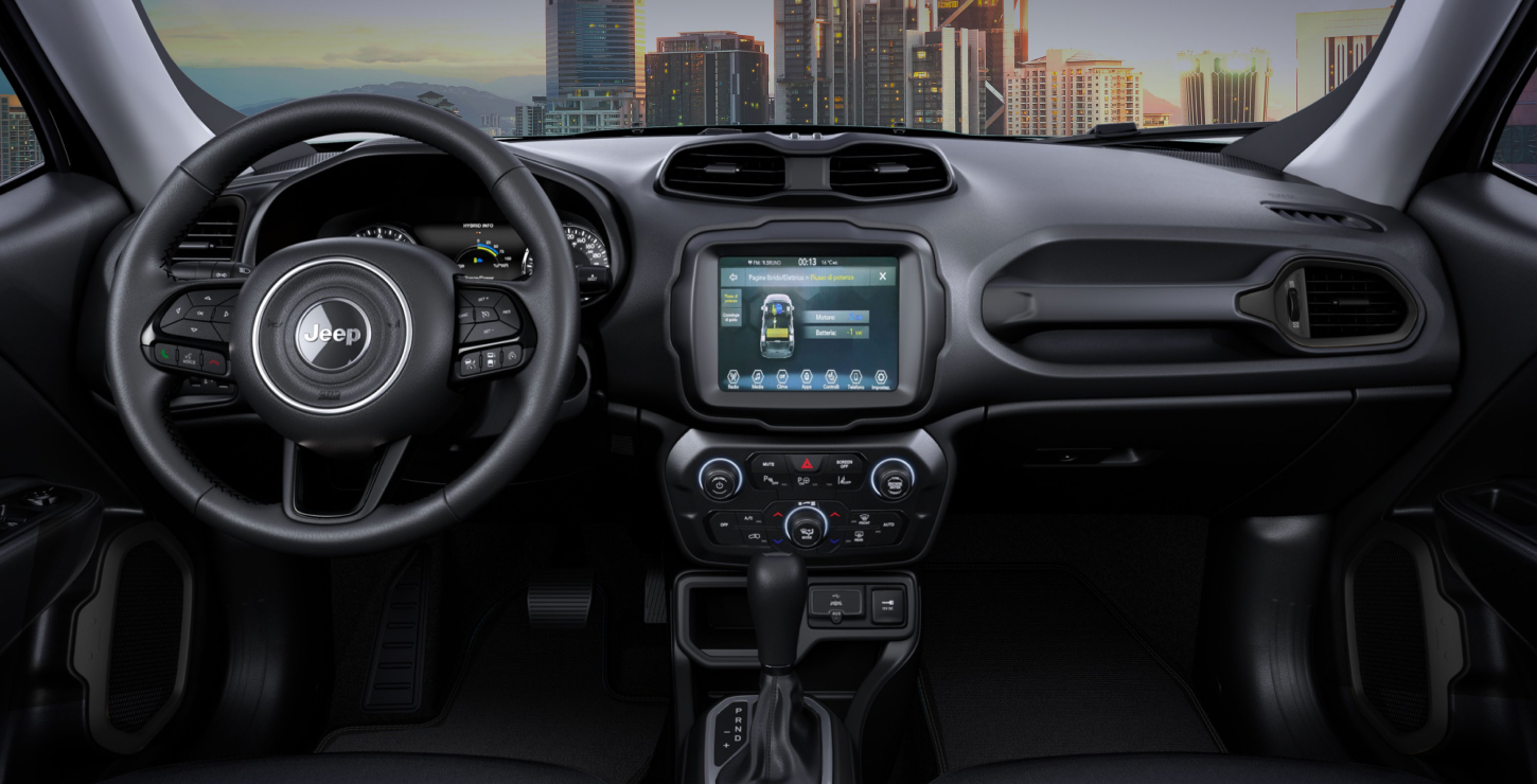 Az új Jeep® Renegade e-Hybrid műszerfala egy elegáns példa a puha burkolattal, felhasználóbarát funkciókkal rendelkező egységre. Az utas oldalán lévő kapaszkodó a Jeep® világából érkező egyedi részlet, körülötte puha tapintású elemek borítják a műszerfalat és az ajtópaneleket. A konzolban plusz rakodótér is rendelkezésre áll a mindennapi eszközöknek, kütyüknek. Összességében az utastér ikonikus stílusú, amely a Jeep® világához tartozást erősíti.