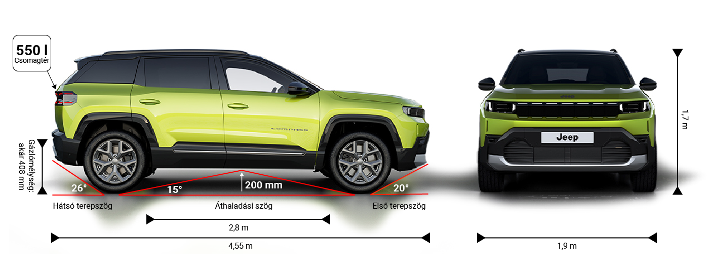 Jeep® Compass e-HYBRID: Üzemanyag-fogyasztás: 5,9l/100km, CO2-kibocsátás: 133 g/km. Becsült WLTP kombinált ciklusbeli értékek, amelyek a végleges típusjóváhagyást követően változhatnak. A feltüntetett értékek összehasonlítási célokat szolgálnak. A tényleges értékek erősen eltérhetnek, és a használati körülményektől, valamint különböző tényezőktől függően változhatnak, mint például: opcionális felszereltség, környezeti hőmérséklet, vezetési stílus, sebesség, a jármű össztömege, bizonyos berendezések (légkondicionáló, fűtés, rádió, navigáció, világítás stb.) használata, gumiabroncsok típusa és állapota, útviszonyok, külső éghajlati viszonyok stb.