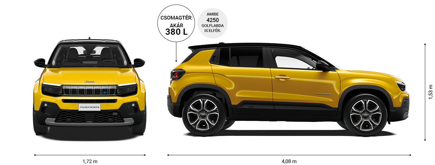 Jeep® Avenger Avenger elektromos energia fogyasztás kWh/100km): 15,9 – 15,3; CO2-kibocsátás (g/km): 0***